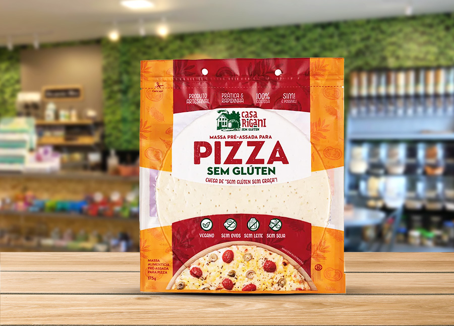 A receita de massa sem glúten para pizza da Casa Rigani não contém glúten, não contém leite, não contém ovos, não contém soja.